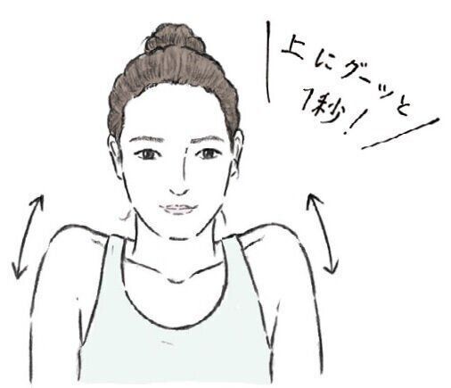 「肩を回すとこわばりがほぐれて血行がよくなるのでいいですね!肩を回す代わりに、"肩を上にグーッと上げて1秒→脱力"を5~6回繰り返すだけでも、僧帽筋がほぐれるのでおすすめ」(土田さん)。