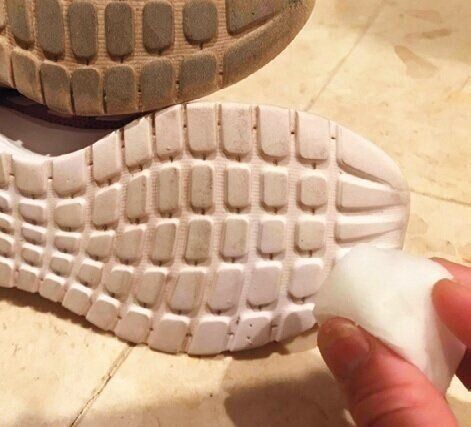 「セスキソーダ水などを含ませるとさらに汚れ落ちアップ!ただし、メラミンスポンジの原理は"研磨"。削られて色落ちすることもあるので、目立たない所で試してから。また溝が浅い靴底だと、溝がなくなって滑りやすくなるので注意して」(みけままさん)。