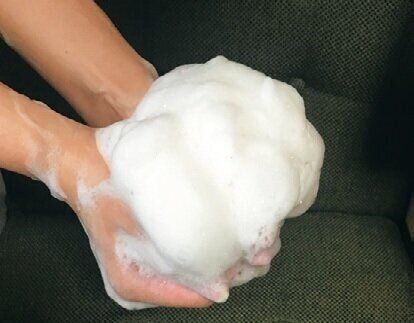 泡立てスポンジでできた泡を、さらに手を洗うように繰り返し泡立てていると、粗い泡がだんだんもっちもちに。濃密な泡は肌と指の摩擦を減らしてくれるメリットが。