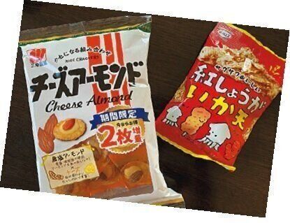 特に三幸製菓の「チーズアーモンド」や、マルエスの「紅しょうがいか天」があると幸せ。子どもが近くにいないタイミングでパクッ♪