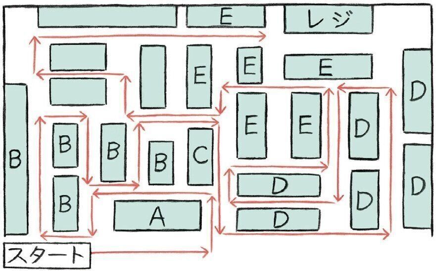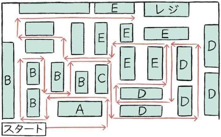 A新商品、Bファッション系、C季節商品、D生活雑貨、Eインテリア系の棚。まずは新商品が並ぶ外側をチェック。アプリやお店のポップの情報で人気商品をすかさずゲット!