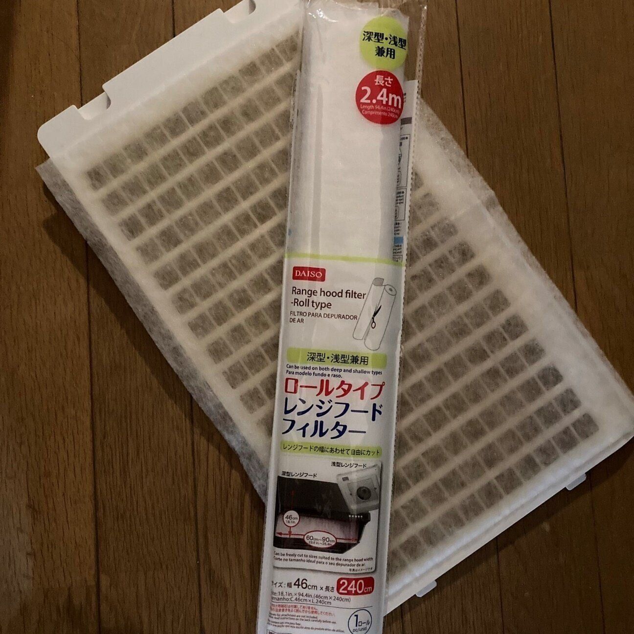 レンジフードの汚れ防止に使っている『ロールタイプ レンジフードフィルタ』(110円)は、好きなサイズにカットして使える便利なグッズです。