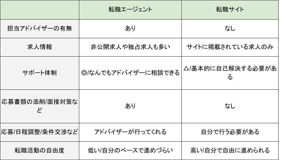 以下では、転職エージェントと転職サイトの特徴を簡単に比較してみました。