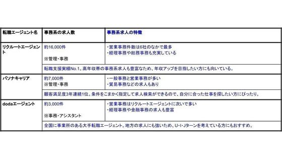 『doda』は、日本最大級の転職エージェントです。事務職専門のスタッフが登録者の転職活動をサポートしてくれます。全体の求人数は非公開含め約10万件です。事務職は約3,000件を保有しています。