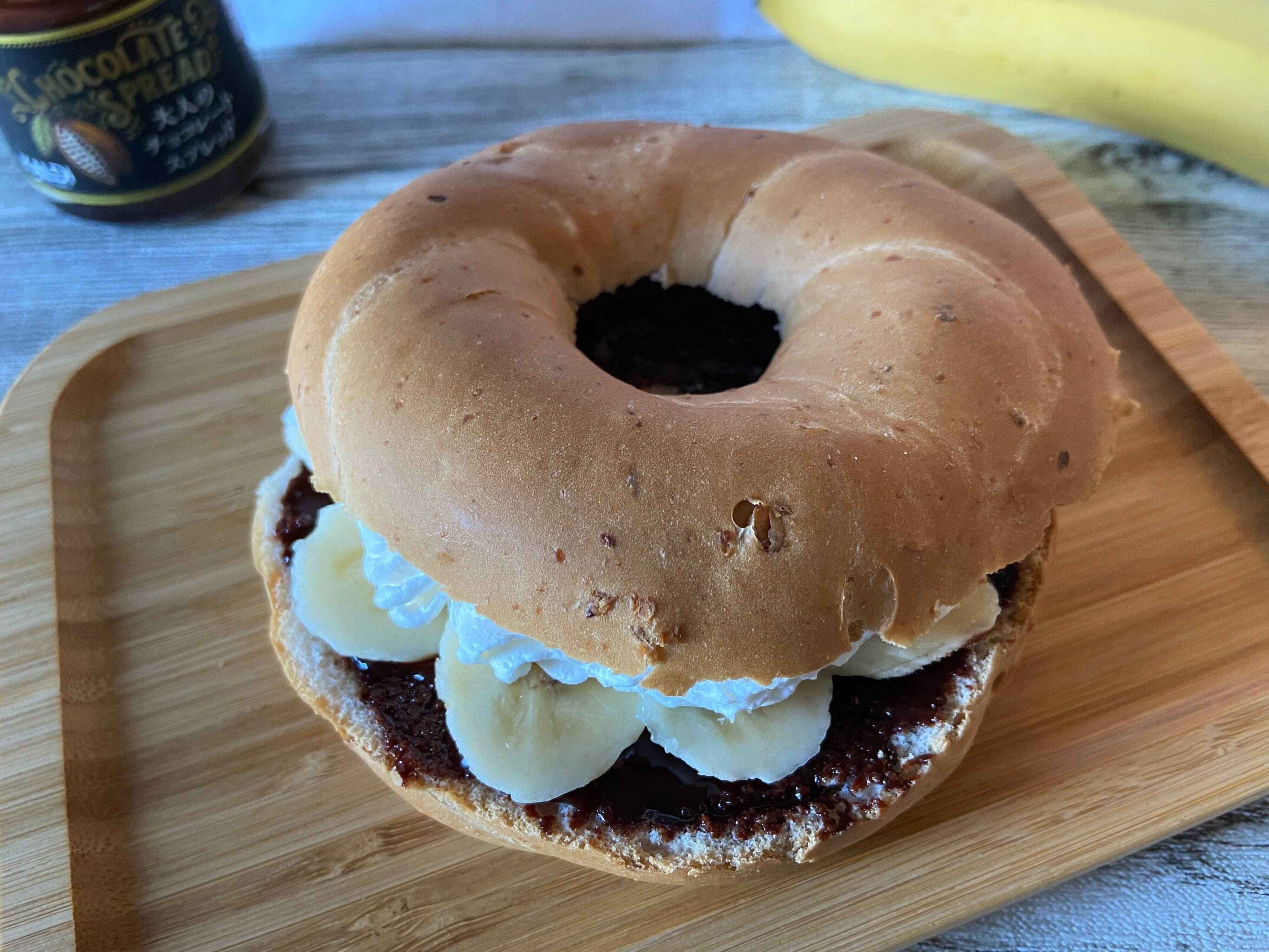 軽くトースターで焼いたベーグルをスライスしてチョコレートスプレッドをぬり、バナナとホイップを合わせてサンド!