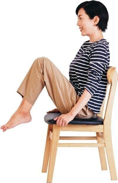 "ニートゥチェスト"と呼ばれる筋トレ。足を床に着けないように注意し、手は座面をしっかりつかむようにして。ゆっくりとていねいに行うのがポイント。毎日続ければ、おなかまわりもスッキリ。