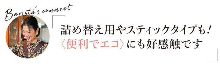 「ネスカフェ ゴールドブレンドバリスタ」にも、詰め替え用としても使える「エコ&システムパック」は昨今の注目商品。「酸化と香りがとぶのから守り、環境への配慮もできていいですね。スティックタイプもライフスタイルに合わせて使いやすい!」(小西さん)