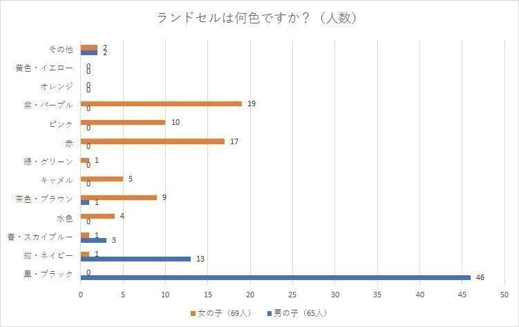 男の子は定番の黒を選んだのが65人中46人。それに対して女の子は、69人中パープルが一番多く19人、次いで赤が17人と続きました。ほかにもピンク、茶系、水色など回答が分かれています。女の子の方が、見た目のこだわりが強く、人とは違うものを持ちたいという心理が働いている可能性も。