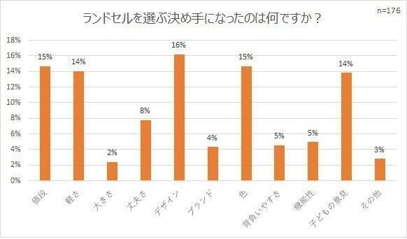 ランドセルを選んだ決め手は色、軽さ、値段など5つの項目が、ほぼ同率でした。