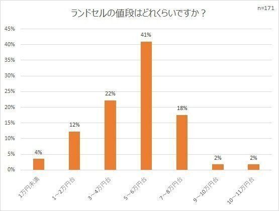 ランドセルの値段は5~6万円が全体の41%で最も多く、続いて3~4万円、7~8万円がおよそ20%という結果でした。