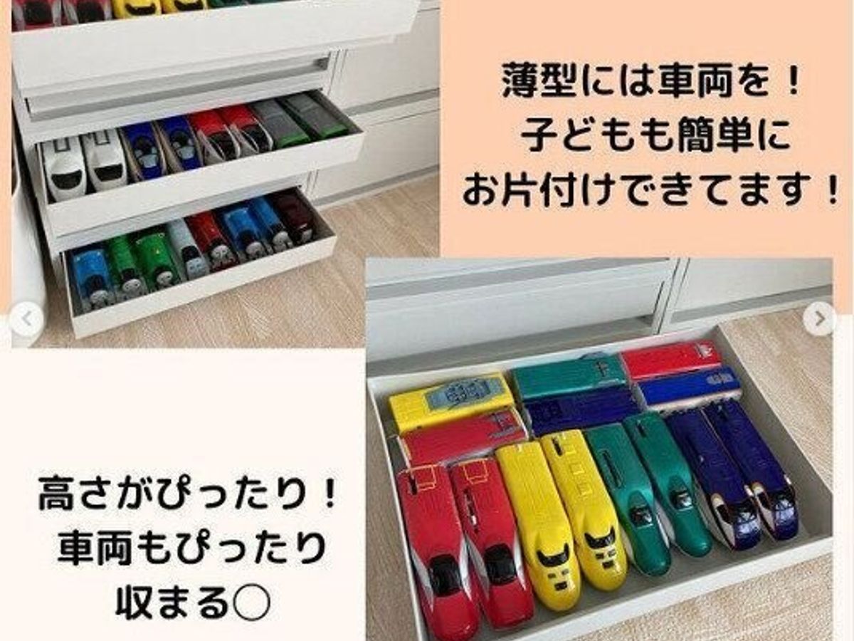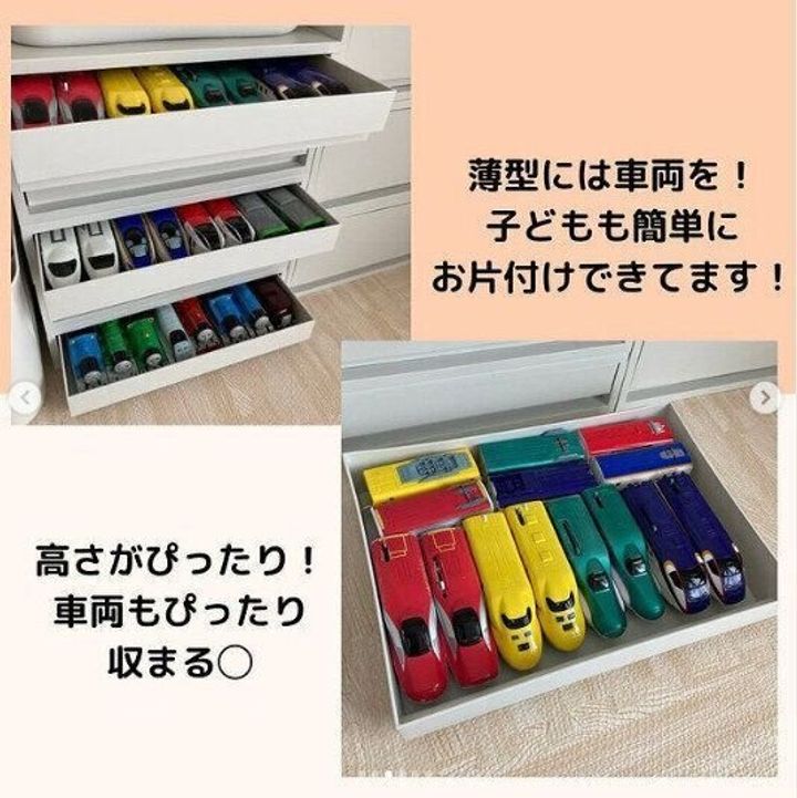 どんどん増える新幹線や電車のおもちゃにお困りのかたも多いはず。こちらの美しい収納をご覧ください!まるでこのおもちゃのためにつくられた収納ケースのよう。高さもぴったり、車両もぴったりおさまっています。引き出しをさっと開けるだけで取りだせるので、子どもたちにとっても探しやすく、お片づけの練習にももってこい。シンデレラフィットできるこの収納ケースは何でしょうか?