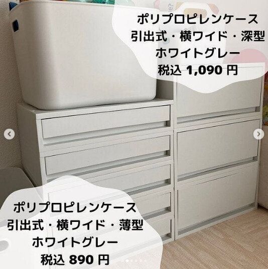 「ポリプロピレンケース・引出式・横ワイド・薄型・ホワイトグレー」(1段890円)です。おもちゃの数に合わせて棚を増やしていくこともでき便利ですよね。写真左側の薄型には車両を、右側の深型タイプ(1,150円)にはレールとパーツを分けて収納。すっきりと収納できて気持ちがいい!部屋中に散らばるおもちゃの収納はこれで決まりですね。