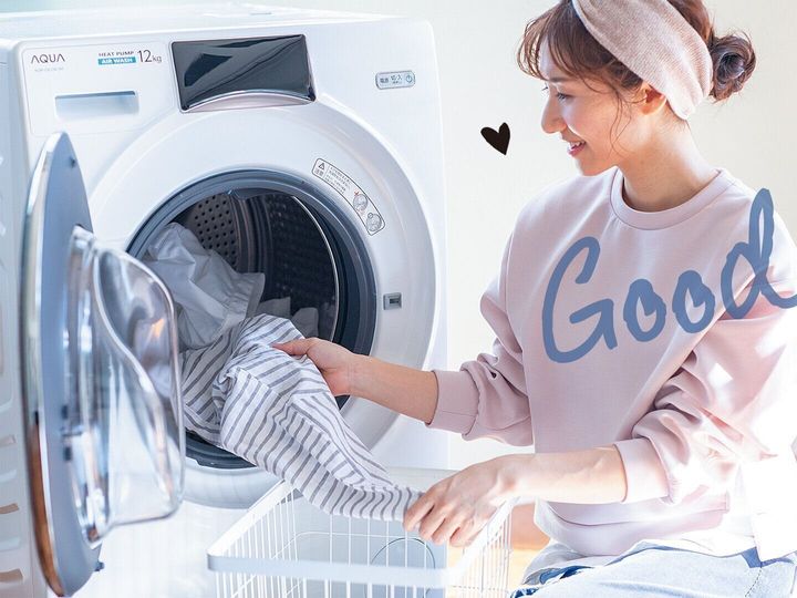 夫婦共働きだと、「洗濯は夜」という家庭も多いはず。そんな人たちにとって、全自動で乾燥までできる「ドラム式洗濯乾燥機」は頼もしい存在。高田さんもドラム式を愛用しているひとりです。「わが家も洗濯は夜する派。寝る前にセットしておけば、朝には乾いているので本当に助かります」と、上手に活用しているそう。なかでもアクアの「まっ直ぐドラム」は、コンパクトなのに大容量。1回で12㎏も洗えて、除菌までできるんです。
