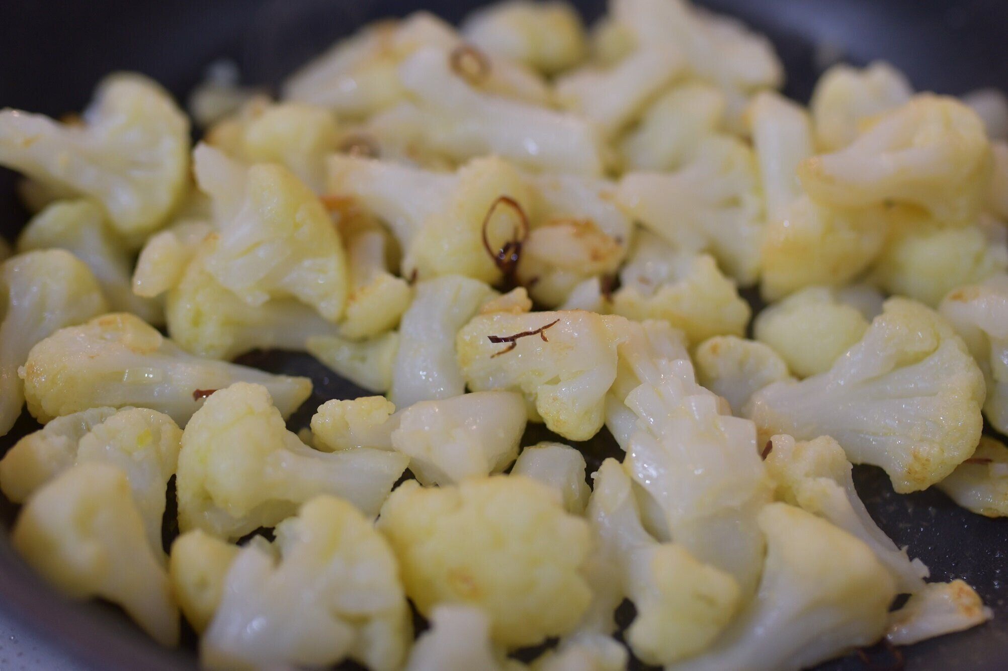 次につくってみたのは、「カリフラワーのペペロン炒め」です。にんにく2片をスライスしたものと、オリーブオイル大さじ1を香りが出るまで加熱したところに、冷凍カリフラワー250gを投入。