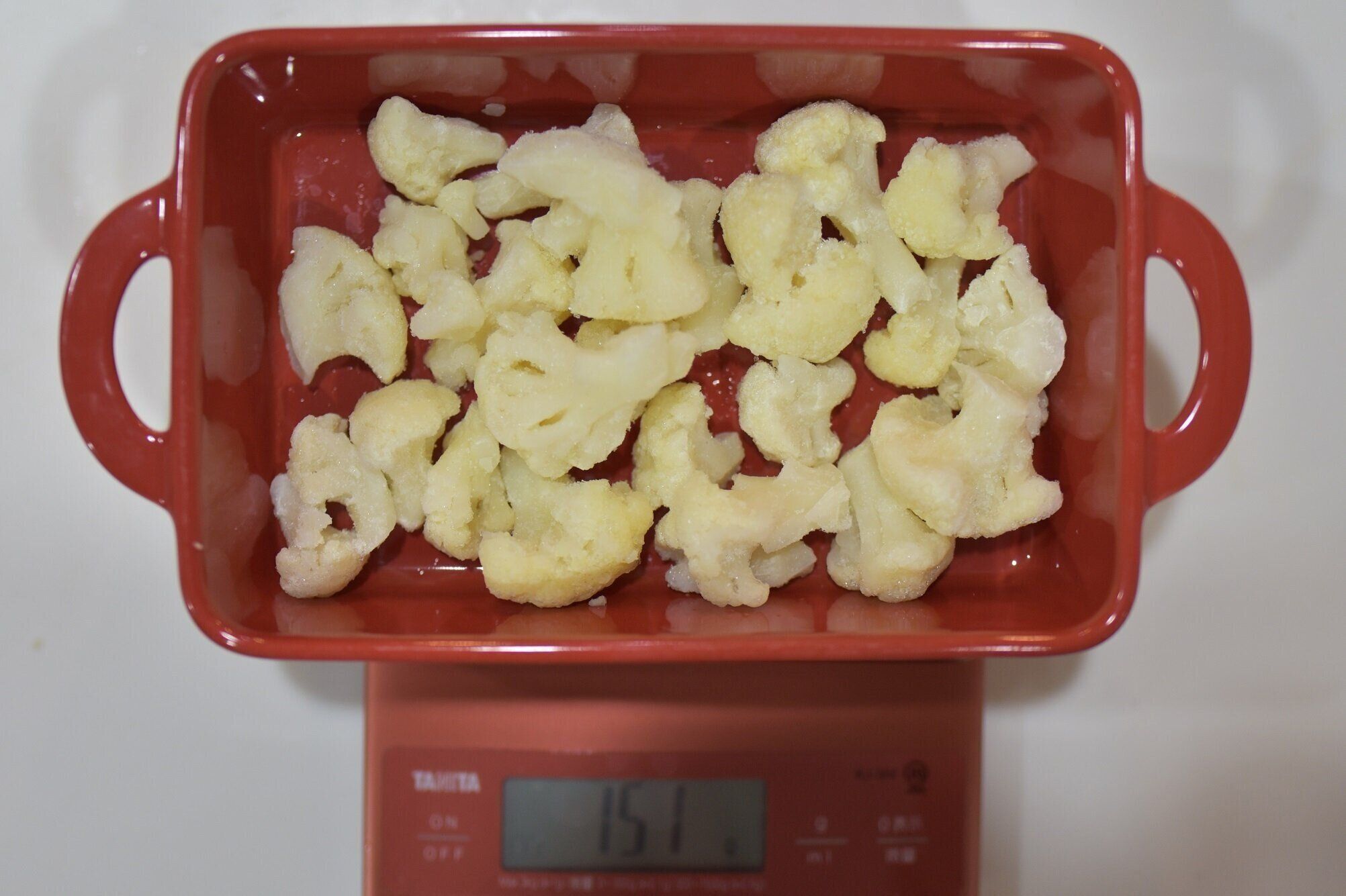 150gのカリフラワーを耐熱皿に入れて500gで5分間加熱。