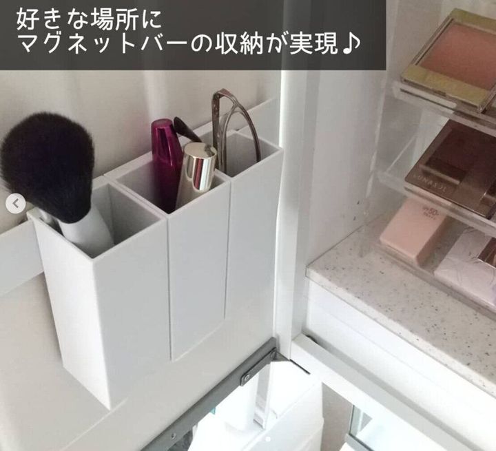 こちらは、無印良品のマグネットバーとポケット、セリアのマグネット用取り付けパネルロングを組み合わせた素敵な収納アイデアです。マグネット用取り付けパネルロングを好きな場所に貼り付けて、マグネットバー、ポケットの順にセットしていくだけでポケットタイプの浮かせる収納が完成しますよ。