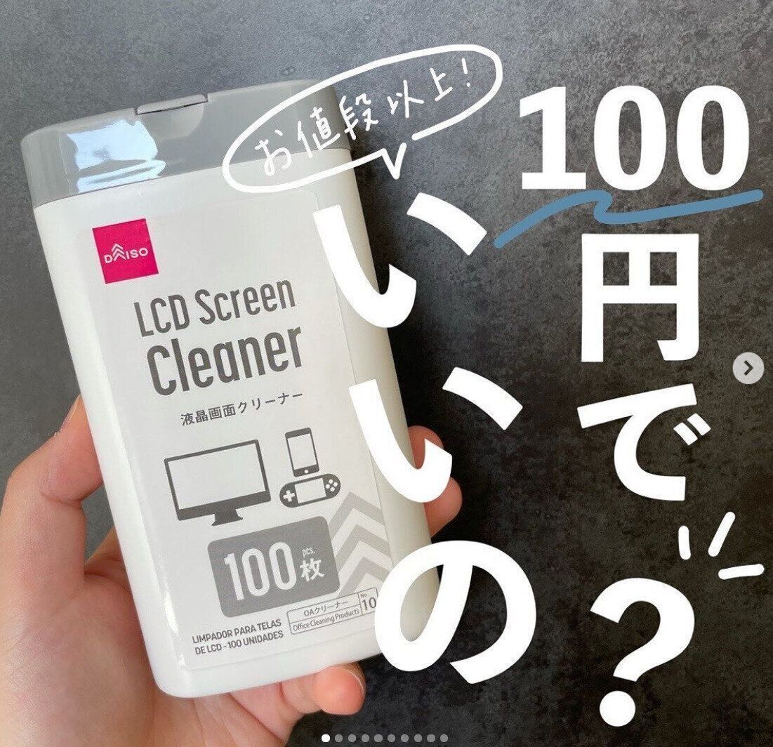 パソコンやゲーム機、スマートフォンなど、身の回りのアイテムをピカピカにお掃除できる液晶画面グリーナー。ウェットタイプのシート100枚入りで110円というコスパのよさで、お値段以上な便利商品です。こまめなお掃除にぴったりのアイテムで、スッキリとしたパッケージデザインでインテリアにもなじみますよ。