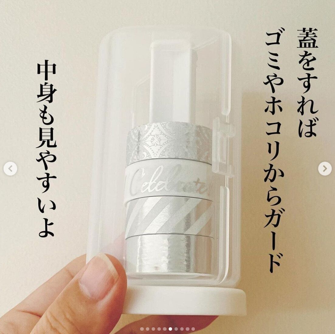 マステコレクターさんたちの間でも話題となっている、マスキングテープ収納ケース。半透明のケースなのでマスキングテープを見せる収納にもできて、ケース自体も2個までスタッキングできる便利アイテムです。フタつきタイプなのでホコリを気にせず保管できるのもうれしいポイント。ケースを倒して引き出しにも収納できます。