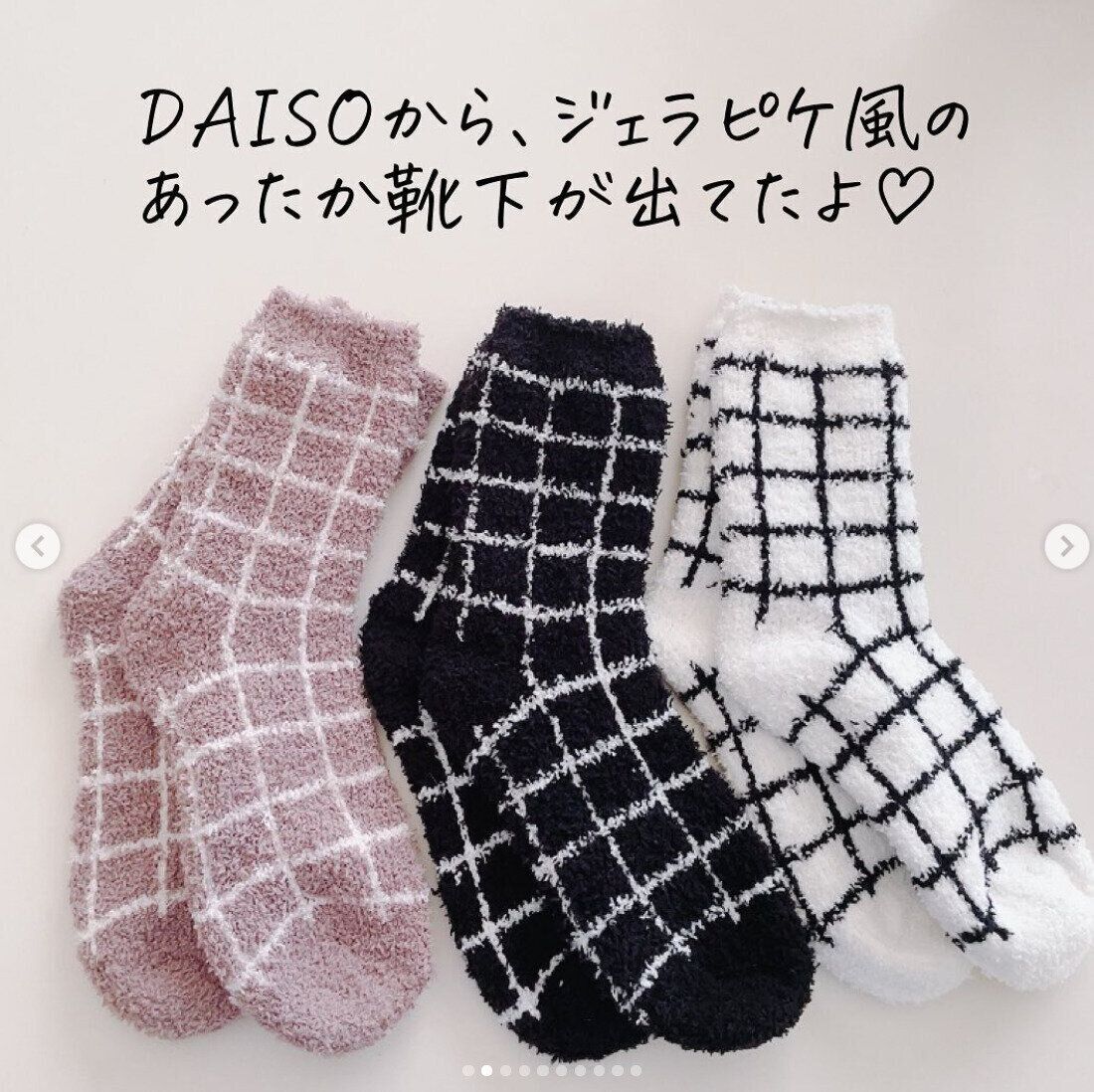 「110円とは思えない!」と人気のダイソールームソックス。肌触りもよく、ふわもこな履き心地に癒されます。洗濯をしても縮みにくいので使い勝手も◎。寒い季節に重宝するおしゃれソックスです。こちらのチェック柄やロゴ入りタイプなど、種類も豊富なのでコレクションするのもおすすめですよ。