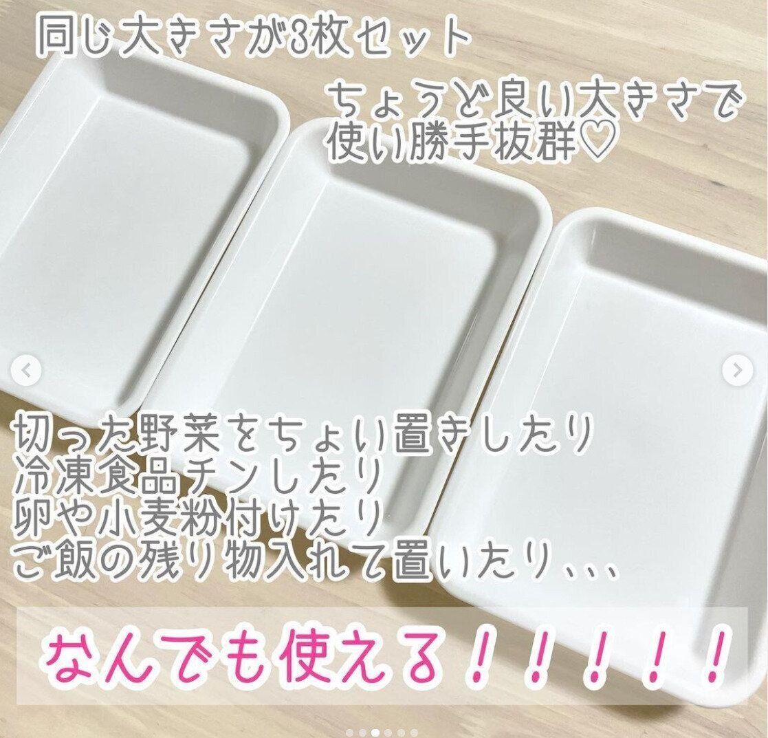 カットした野菜を乗せたり、揚げ物を並べたり…。「とにかくなんでも使えて便利!」と話題のセリアのお料理バット。こちらは同じ大きさの3枚セットで、電子レンジ&熱湯可です。使わない時はコンパクトに重ねて収納もOK。110円で3枚と、コスパもいいのがうれしいです。