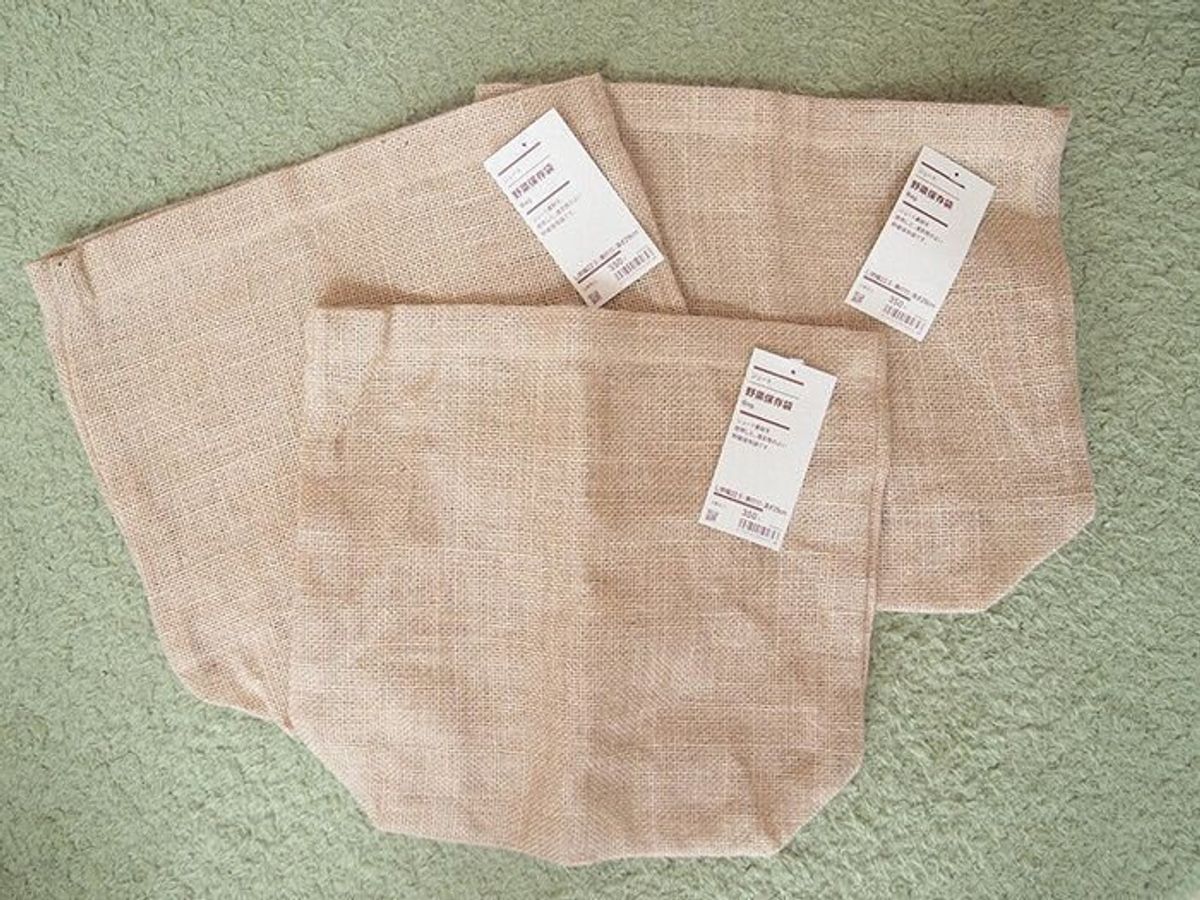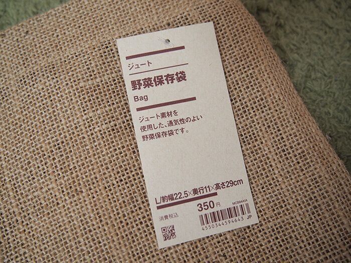 無印良品で一世を風靡した「ジュートマイバッグ」シリーズと同じジュートでつくられた野菜袋。かなり、柔らかくて軽い素材です!現行ではSサイズとLサイズが発売されている模様。我が家は、ひとまずLサイズ袋を3つ買ってみました。
