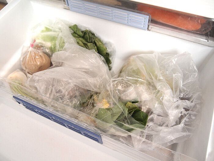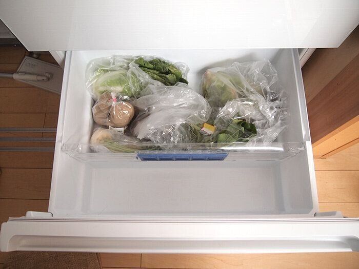 これが我が家の無残な野菜室です。撮影用に多少手前などきれいにしたこともあって、一見すると整頓されているようですが……よく見ると野菜どうしが重なり合って、なんの野菜がどれだけあるのか、よくわからなくなっています。結果、野菜を腐らせてしまう…。