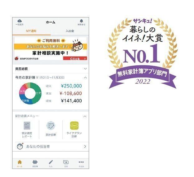 アプリを銀行やカードと連動させることで、お金の流れを自動でグラフ化。レシートを撮影するだけで家計簿に反映。困ったことがあればプロに相談も可能。/SOMPOひまわり生命