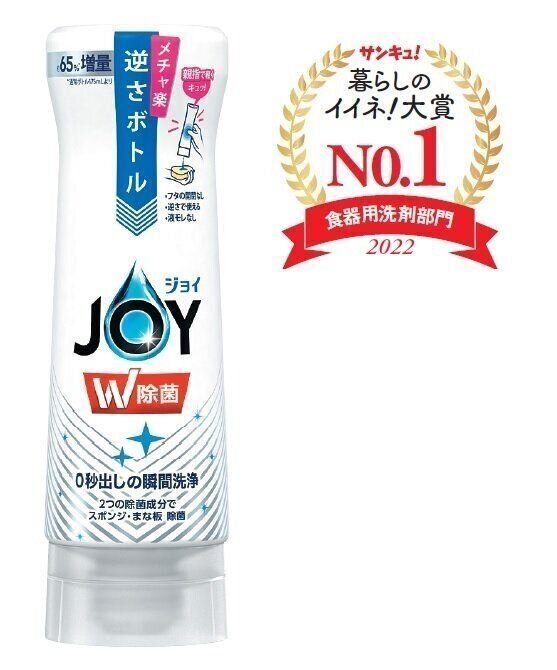 「逆さボトル」により、本体をつかんで軽く握るだけで即座に洗剤を出せる"瞬間洗い出し"が可能に。液垂れもしないので便利。「ジョイ 逆さボトル」オープン価格/P&Gジャパン