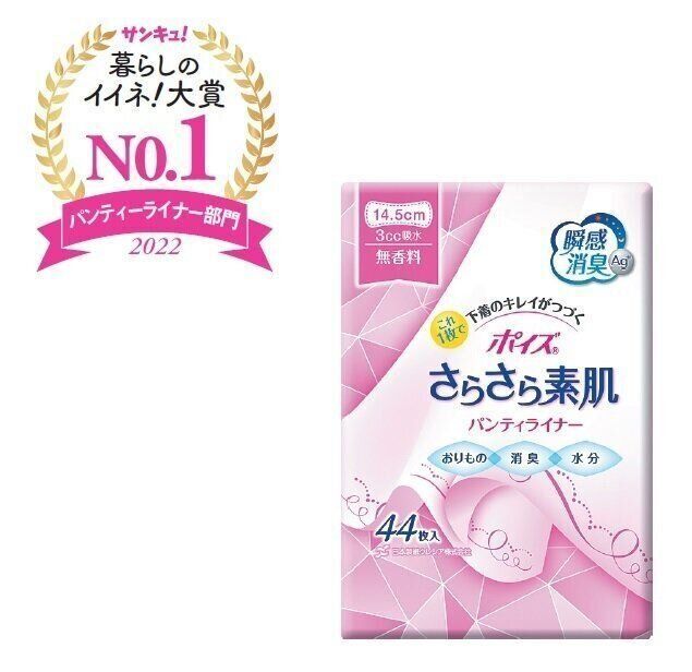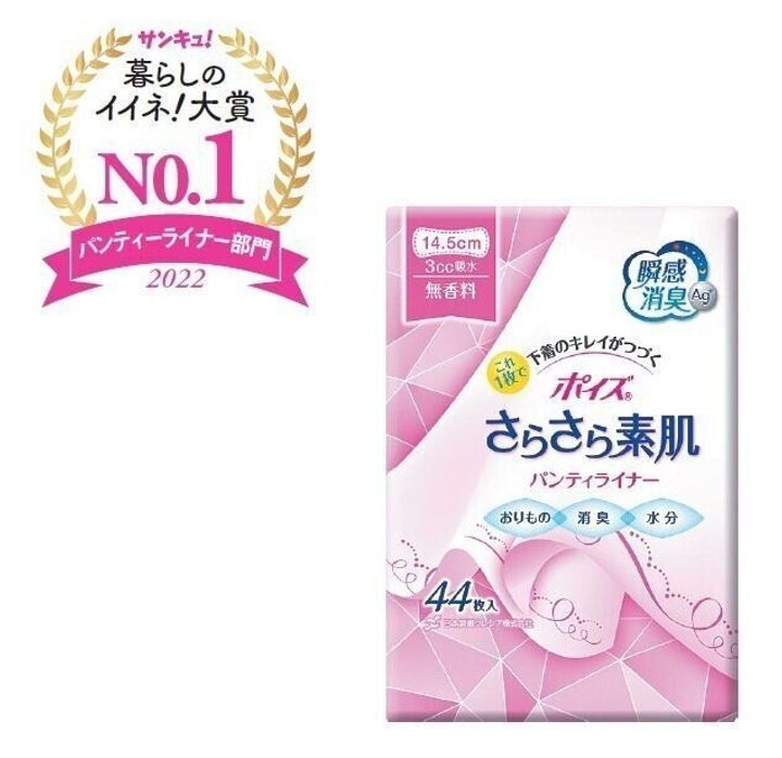 おりもの、消臭、水分をまとめてケアし、1枚で下着を清潔に保てる。「ポイズ さらさら素肌 パンティライナー 無香料44枚」¥260(編集部調べ)/日本製紙クレシア