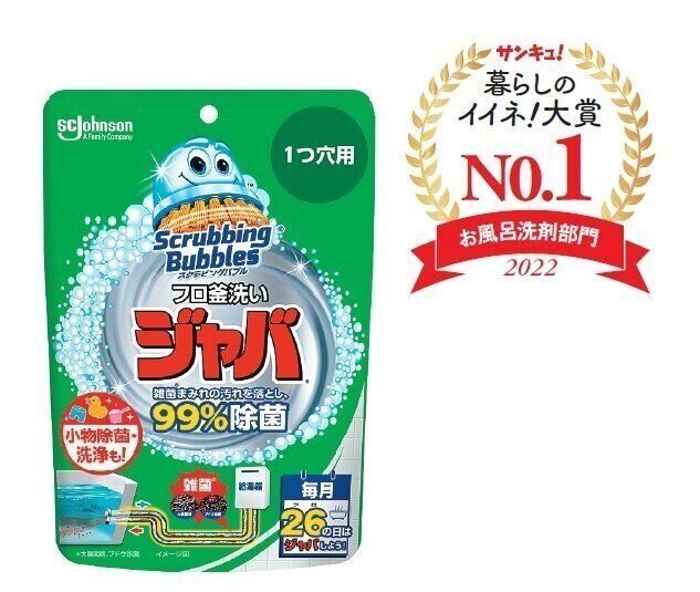 ジャバを入れ追いだきするだけで配管や風呂がまの除菌が完了。風呂ふたなど洗うのが面倒な浴室小物もつけ置きで洗浄・除菌。手間なく清潔なお風呂に。(1つ穴用)オープン価格/ジョンソン