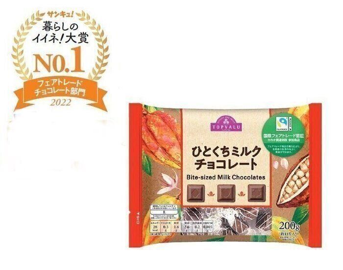 原料となるカカオをフェアトレードとして調達しているチョコレート。ラベルが目印。「トップバリュ ひとくちミルクチョコレート」(200g)¥257/トップバリュ(イオン)