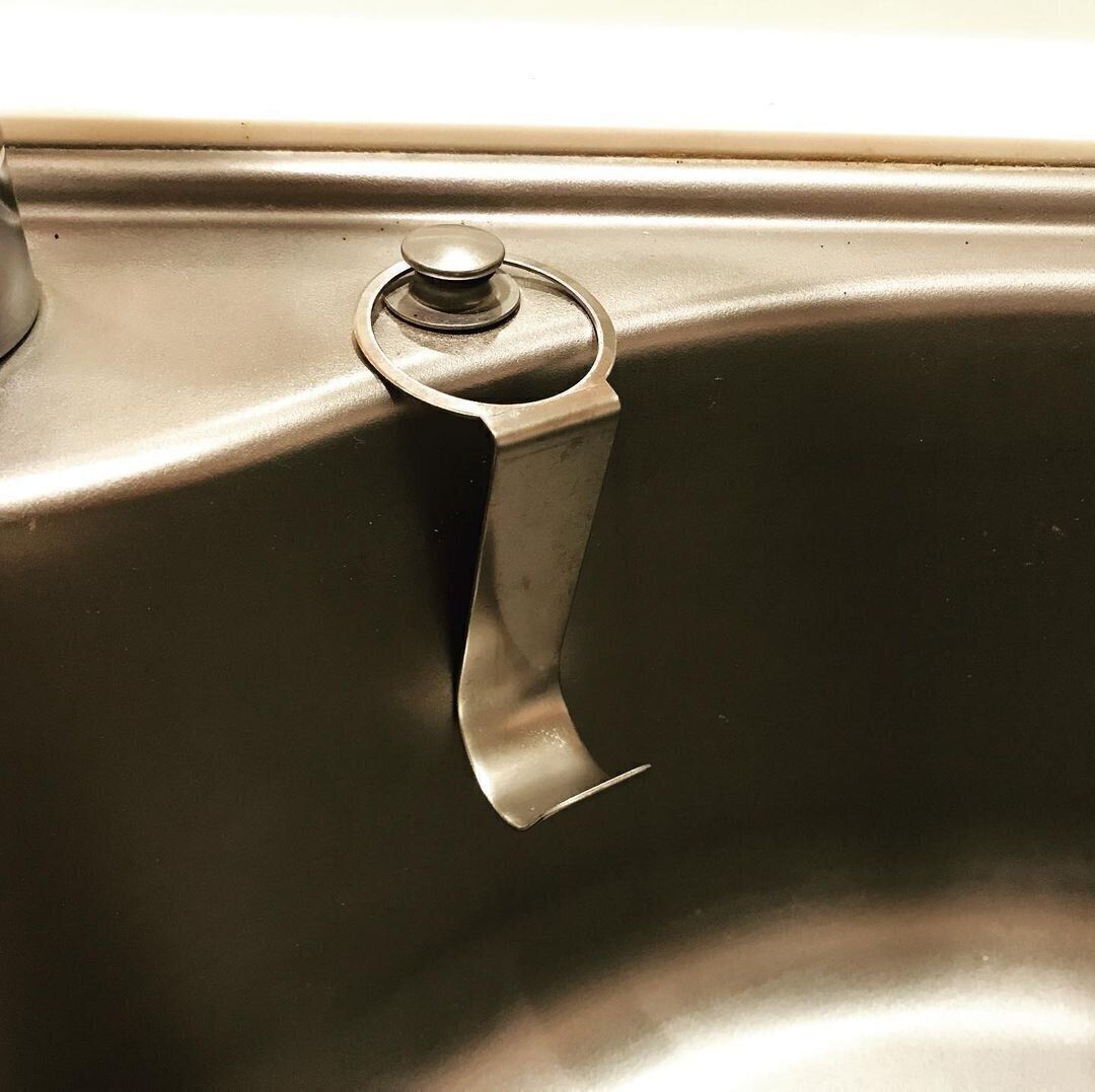 ステンレスボトルハンギングフックを使ったユニークなアイデアには、キッチンシンクの収納バスケット用の「でっぱり」にボトル口用のリングを引っかけて、キッチンスポンジホルダーにするというものがありました。お手入れがしやすく、ホルダーのサビや汚れを最小限にすることができるというメリットがあります。