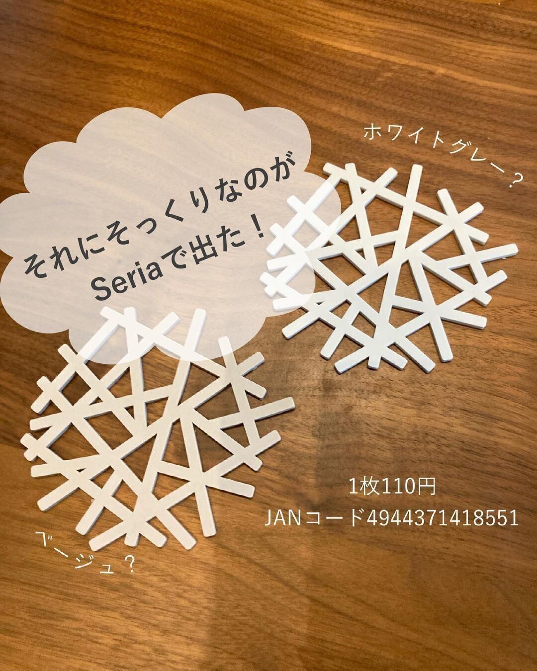 インスタで人気の雪の結晶のようなデザインのコースター。楽天市場で探すと3枚で1,000円~1,500円くらいする商品なのですが、セリアでよく似たものが1枚110円で買えると話題です。カラーバリエーションは、グレーとベージュのみのようですが、シンプルで落ち着いたカラーのコースターがほしいというかたにはおすすめのアイテムです。