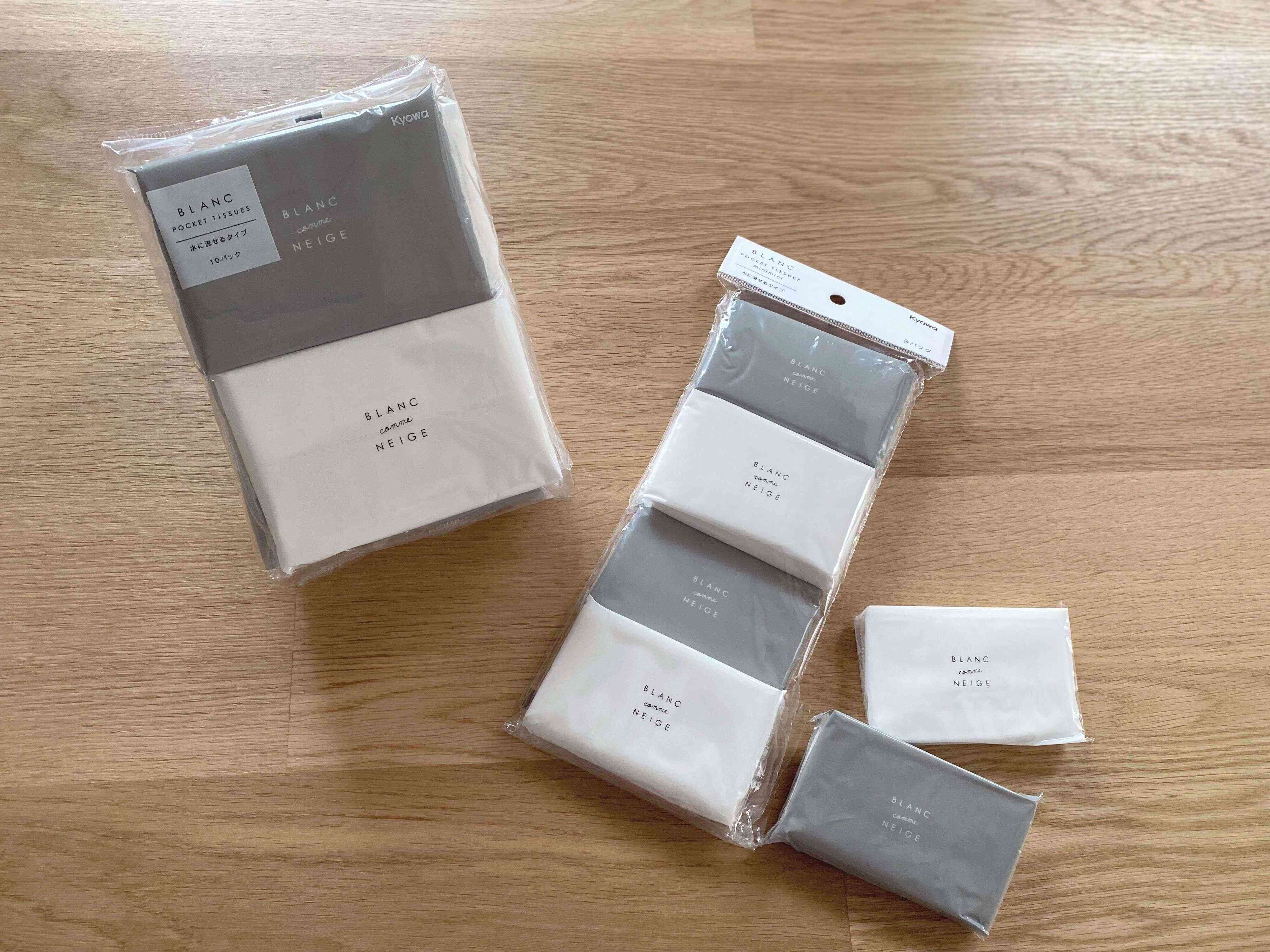 サイズが205mm×197mmのものは10パック入りなのですが、もうひと回り小さいミニミニポケットティッシュはサイズが195mm×165mmで8パック入り、子どものポケットにも入るサイズです。