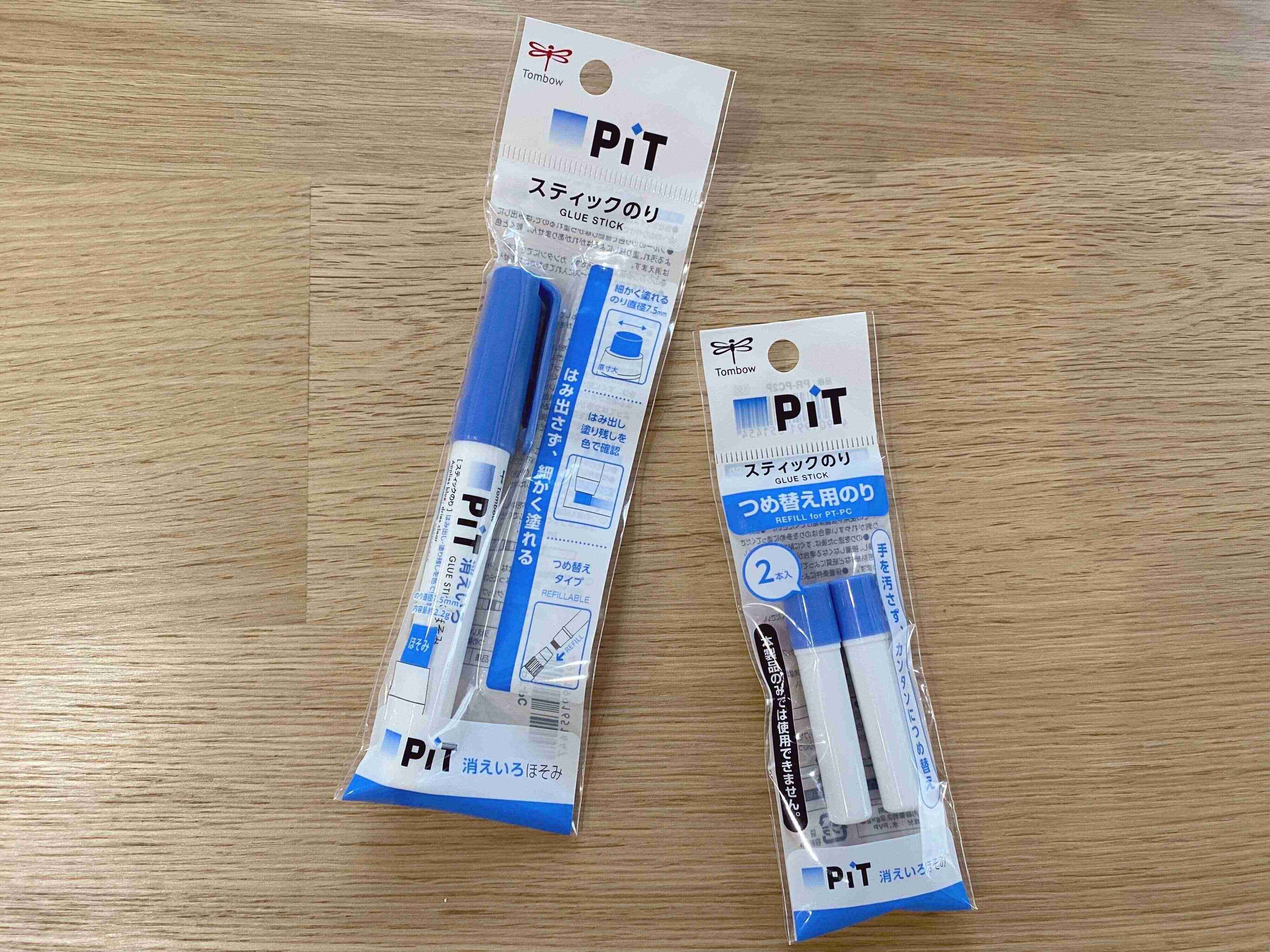 トンボ鉛筆の「消えいろピットほそみ」は、ペンサイズの細さのスティックのりです。別売りで専用の詰め替えのりもあります。
