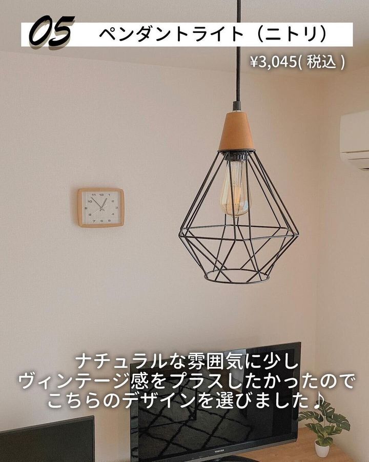 ペンダントライト(3,045円)は、黒色のスチールとウッドでできたヴィンテージ調のアイテム。このライトがひとつあるだけで、お部屋のムードが一気におしゃれになります。ハードな雰囲気を少しだけプラスしたいときに、このアイテムがぴったりです。