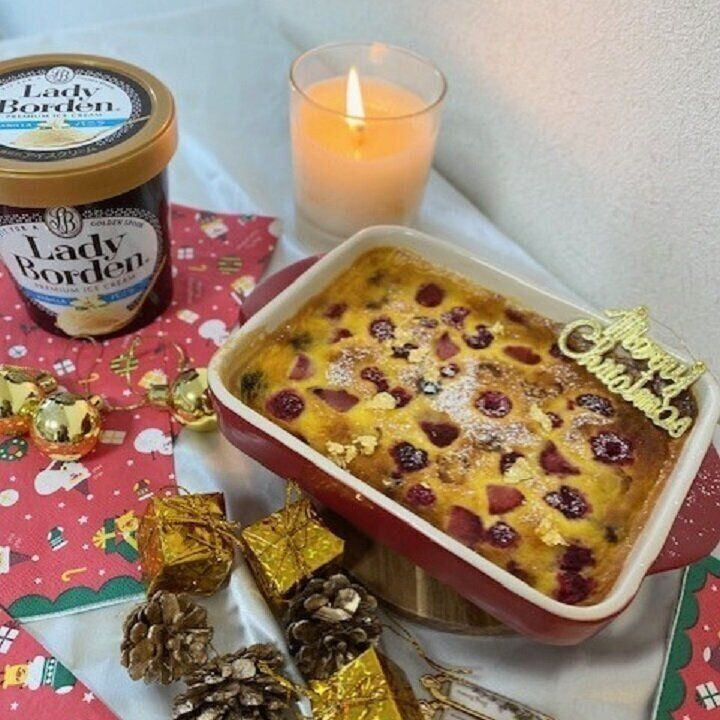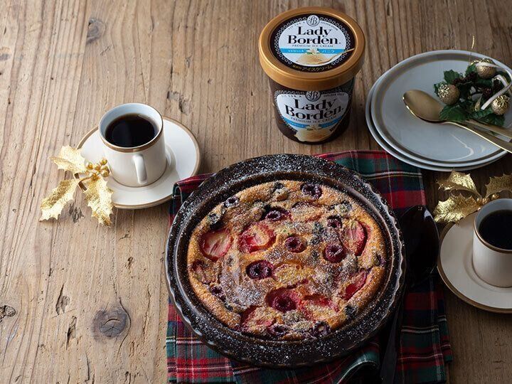 2.バターを薄く塗った耐熱容器に1を流し入れ、ミックスベリーを散らす。180℃に予熱したオーブンで25~30分焼く。