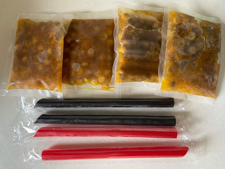袋ごと熱湯で4分ほどボイル調理、温めた原液をグラスに注ぎ、牛乳150ml、氷100gを注いでよく混ぜれば完成。