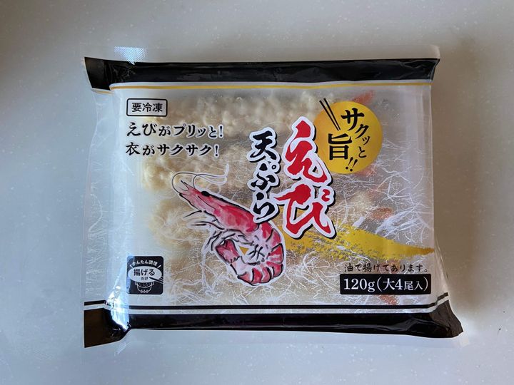 大4尾入り、120gの揚げ調理済みのえび天ぷらが冷凍で販売されています。コスパの良さ・おいしさでリピート購入しているお気に入り商品。