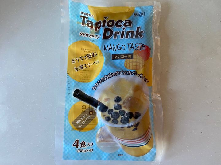 3つめはおやつや食後にも楽しめる、タピオカドリンクマンゴー味(購入時:268円)です。定番のミルクティのタピオカドリンクに、マンゴー味が新登場。タピオカドリンクの本場、台湾より直輸入の本格的な商品です。
