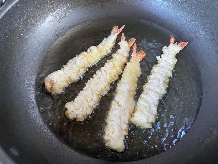 冷凍のままのえび天ぷらを少なめの油で4分ほど揚げました。揚げる手間はありますがあっという間に揚がるので、一から天ぷらをつくることを考えればかなり時短調理になっています。