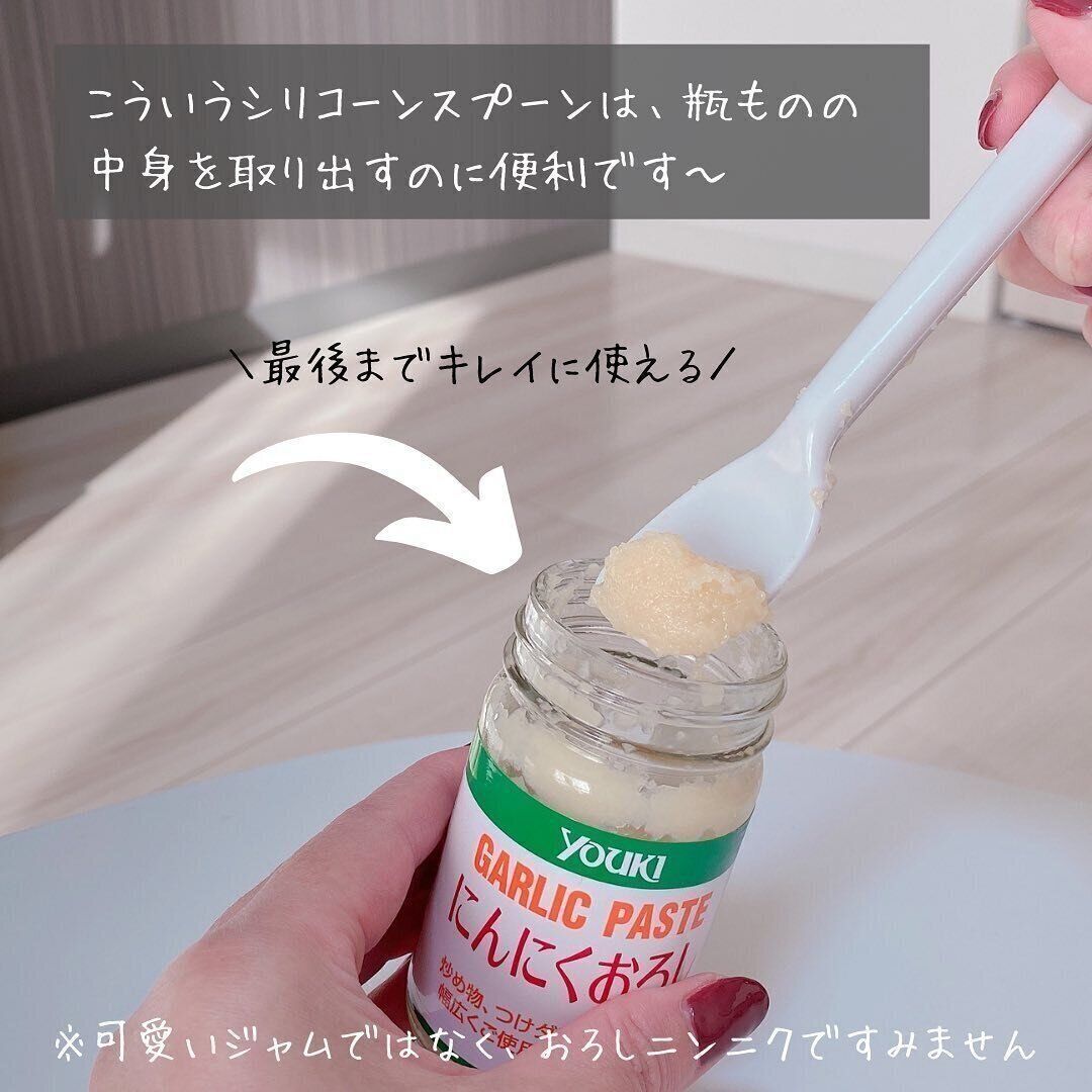 びんに入ったジャムやスプレッド。開封したばかりならよくても、底が見え始めてくるとなかなかすくいにくくてイライラすることがありますよね。このストレスを解消してくれるのが、ダイソーのシリコーンスプーンなんです。シリコーン素材のヘッドが底のふちにたまった中身もすくってくれます。サイズ感もちょうどよく、使い勝手のよいスプーンです。やわらかい素材なので乳幼児用のスプーンとして使うアイデアも人気がありました。