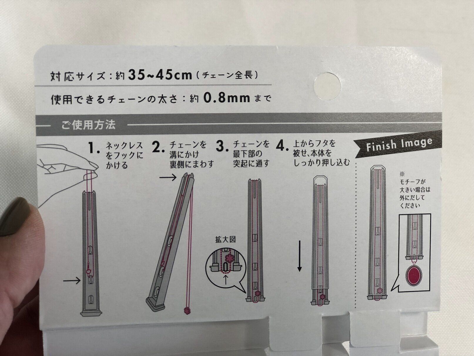 ケース自体のサイズは約20×13×H118mmで、長さ35~45cm・太さ約0.8mmまでのチェーンに対応しています。価格は110円で、2個入りなのもうれしいですよね。