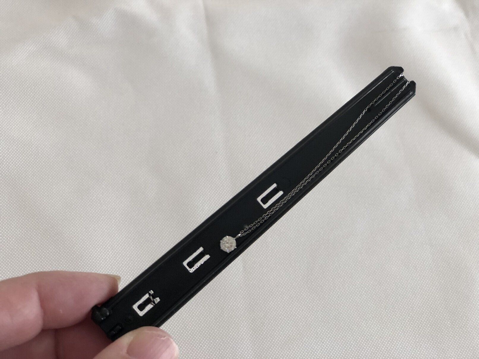 上部の穴からトップ部分だけだすことができるので、大きなモチーフつきのネックレスにも使用できます。ケースに収まらないサイズのモチーフがあっても大丈夫。