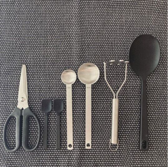 こちらは無印良品のキッチンツール。シリコーン調理スプーン、ステンレスマッシャー、柄が長い計量スプーン、シリコーンミニスプーン、キッチンバサミなど。どれもシンプルでおしゃれ、スタイリッシュですね。