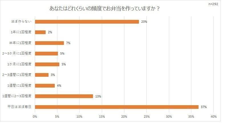 お子さんのいる20代~50代の女性にアンケートをしたところ、お弁当は「ほぼつくらない」よりも「つくる」派が多く、なかでも「平日ほぼ毎日」という人が37%で最多。1週間に1~3回程度作る人を含めると約半数の人が日常的にお弁当を作っているという結果になりました。