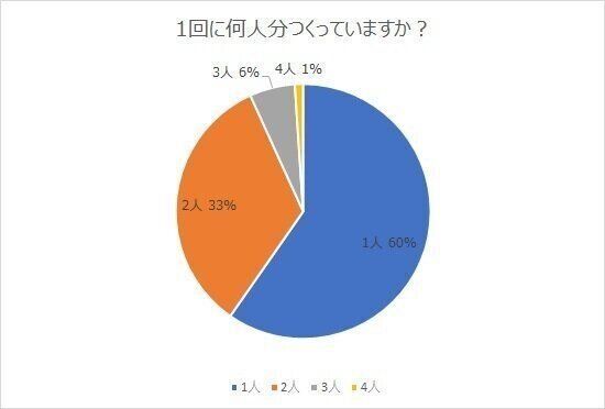 「1人分」(60%)が過半数を占め、「2人分」(33%)と続きます。3人分以上つくっている人の中には、家族全員分を用意していることも。