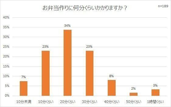 朝の貴重な時間の中でお弁当をつくっている人は、どれくらいの時間をかけているのでしょうか? アンケートでは、ほとんどの人が30分以内につくっているようです。