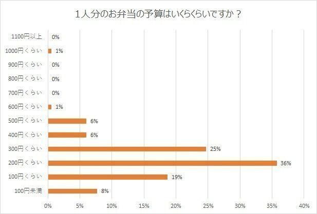 毎日お弁当をつくるとなると、食材費もきになるところですが、お弁当1食あたりの予算は「200円」(36%)と答えている人が最多で、約8割は1食300円以下の予算でお弁当をつくっていると回答していました。