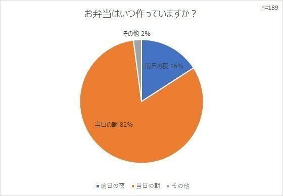 朝はドタバタしているご家庭が多いと思いますが、いつお弁当を作っているかと聞いたところ、82%の人がお弁当を「当日の朝」つくっていると回答しています。